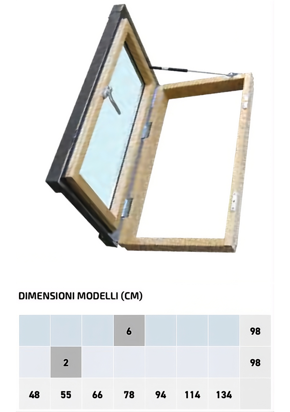L’apertura è ottenuta mediante 1 molla a gas la cui forza è regolata per accompagnare il telaio con gradualità e per permettere due posizioni di apertura