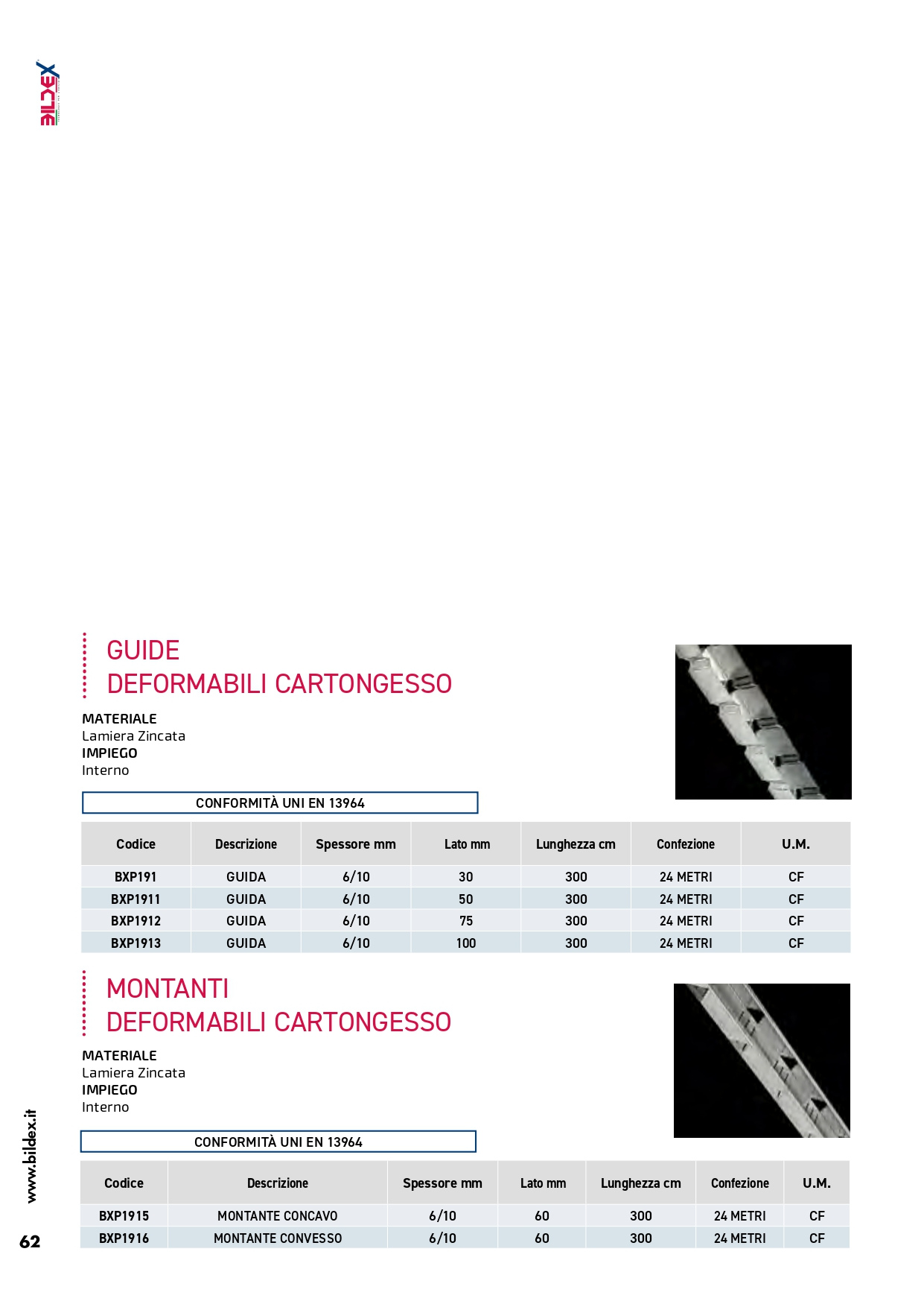 Guide e montanti zincati deformabili per cartongesso
