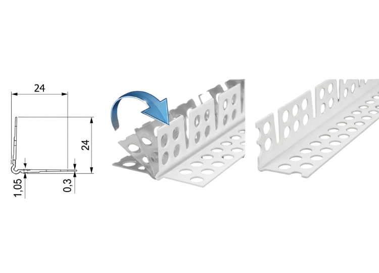 - Ad archi e curve e ad angolo variabile: hanno un lato “tagliettato” che permette di piegare il profilo; sono nastri flessibili rinforzati con PVC, vengono utilizzati per archi con angoli fuori squadra o angoli acuti (mansarde), servono anche per rifinire gli archi, nicchie, curve e cartongesso calandrato.